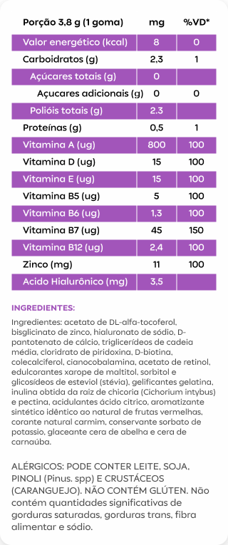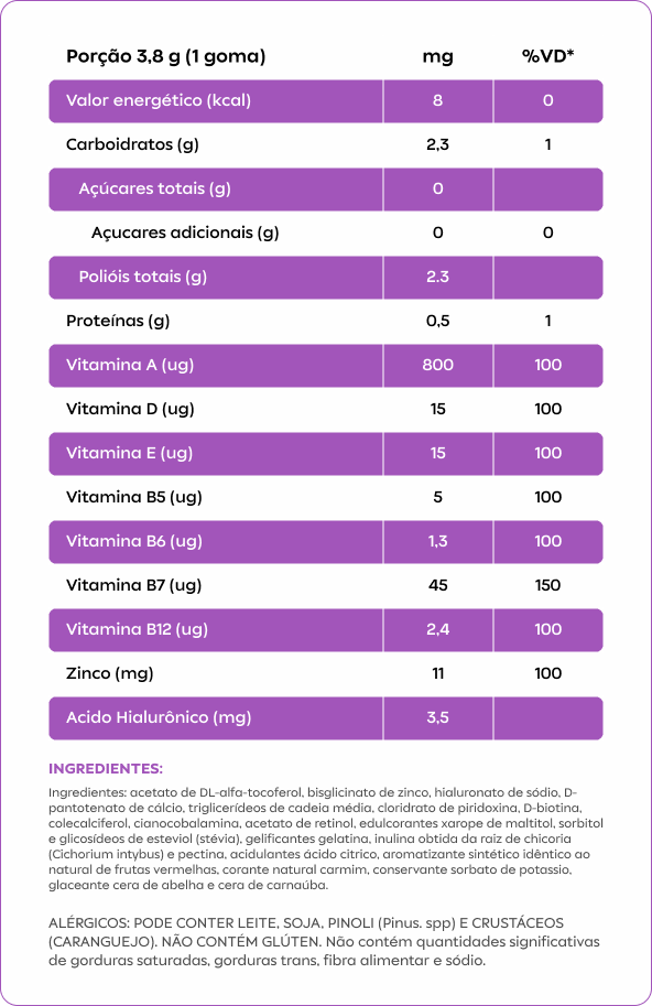 Melhora da aparência e saúde da pele: A combinação de vitaminas A, E, zinco e ácido hialurônico contribui para uma pele mais saudável, hidratada, com maior elasticidade e menos rugas. Para o cabelo e unhas: Crescimento e fortalecimento: As vitaminas do complexo B, biotina (vitamina B7) e zinco são essenciais para o crescimento e fortalecimento de cabelos e unhas. A biotina contribui para a produção de queratina, proteína que compõe os cabelos e unhas. O zinco auxilia na síntese de proteínas e no crescimento celular.